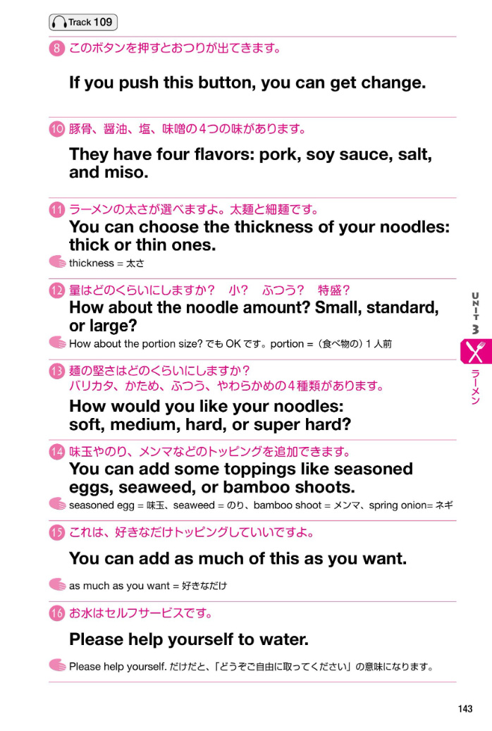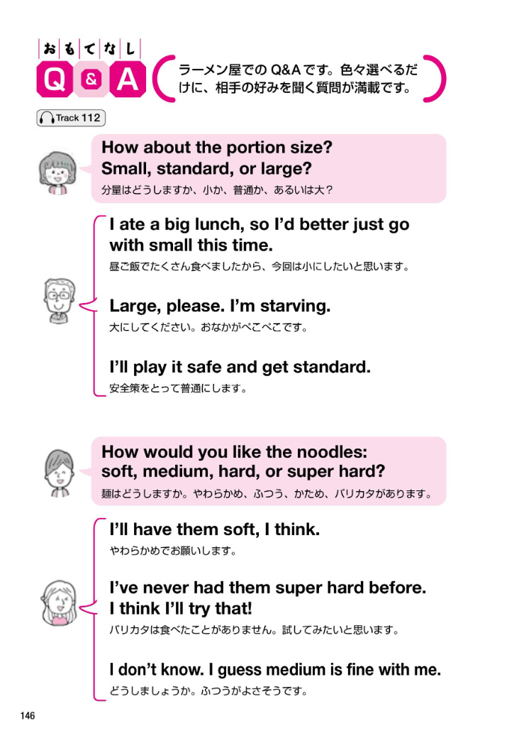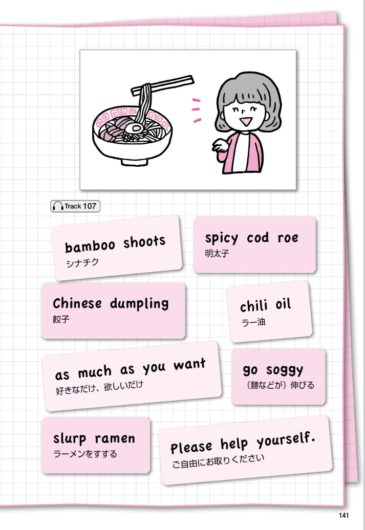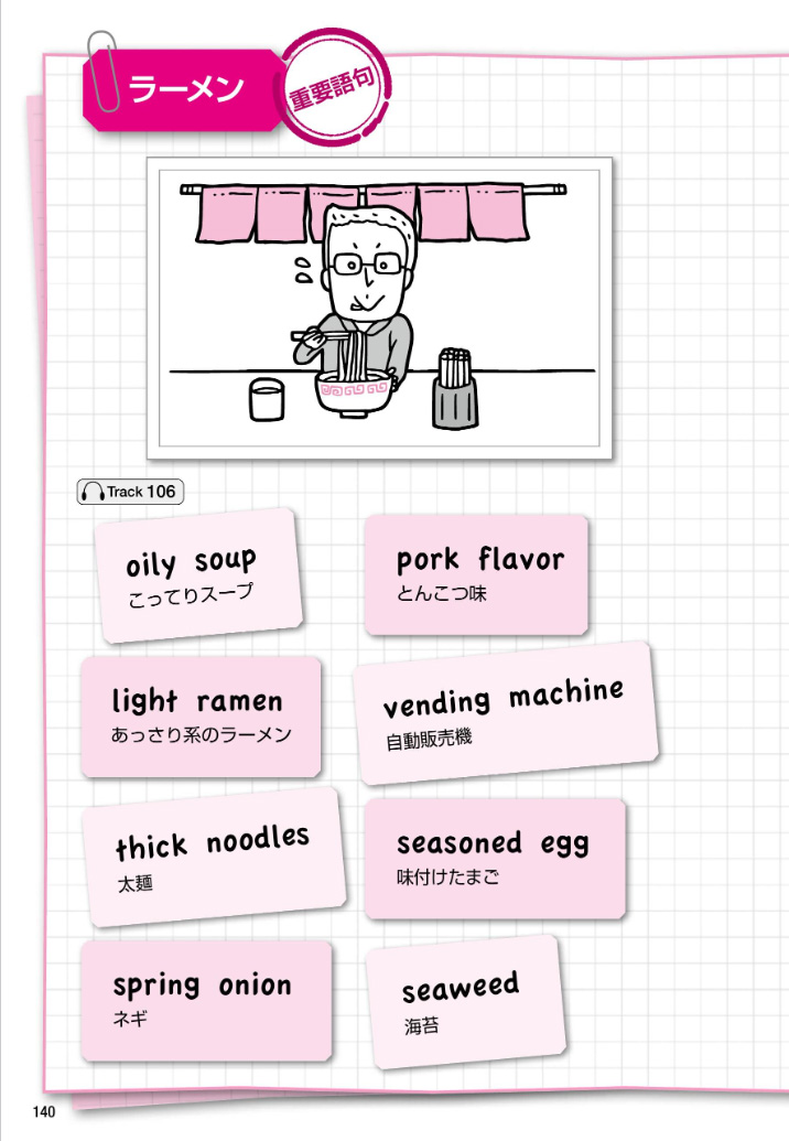 道を聞かれた、電車の乗り換えを説明する、神社のお参りの仕方、デパート・家電量販店・ドラッグストア・コンビニで買い物、ラーメンの注文方法、日本の伝統文化や年中行事について説明するなど、よくあるシーン別に必要な英語フレーズを集めました。