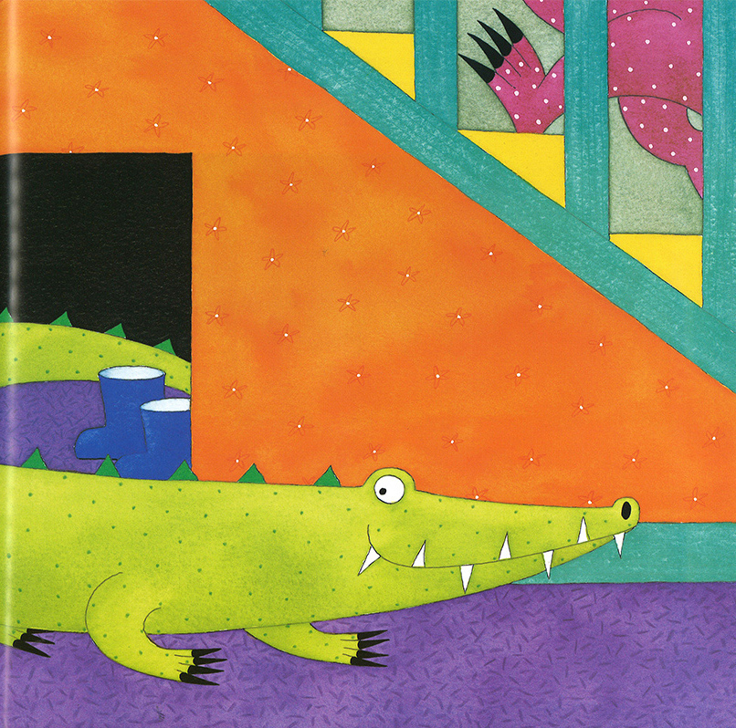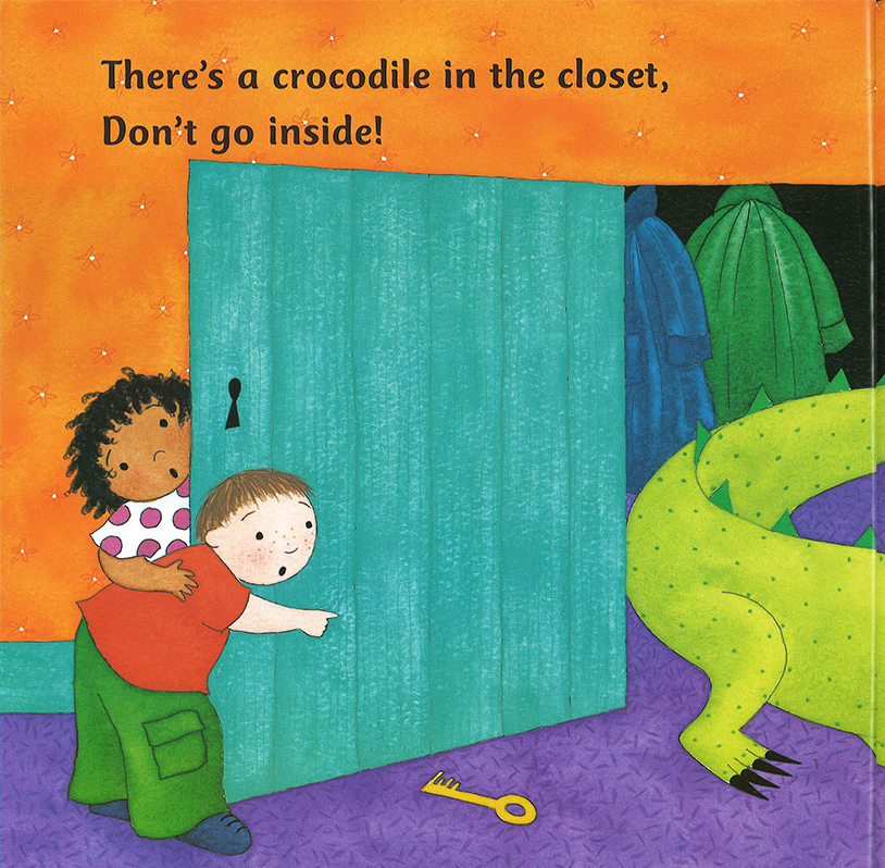 玄関にいたドラゴンをクロゼットに閉じ込めたら、そこにはワニがいて。ワニとドラゴンを屋根裏部屋に連れて行って、さっと逃げようとしたらクモの巣を張った大きなクモがいて。お家の中のいろいろなところに、いろいろな動物がいて大変です。最後には子どもたちと動物たちみんなでかくれんぼ。木の陰や茂みの中に巧妙に隠れている動物を全部みつけることができるでしょうか。