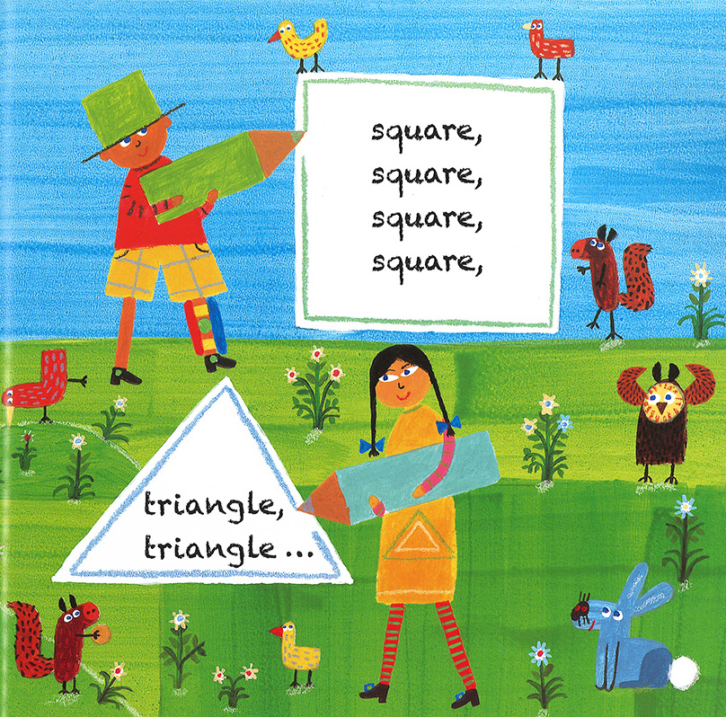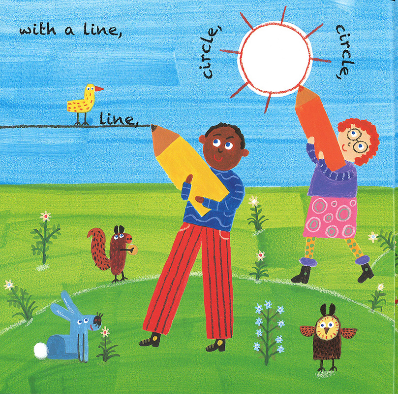 線と円と四角と三角さえあれば、なんでも描けちゃう。高層ビルも、水上のボートも、砂のお城も、動物たちがいっぱい参加したパーティーも。昼間はもちろん、夜だって夢の中で描き続けよう。図工と音楽とダンスの時間を組み合わせたような、楽しい絵本。手遊び歌にも使えます。