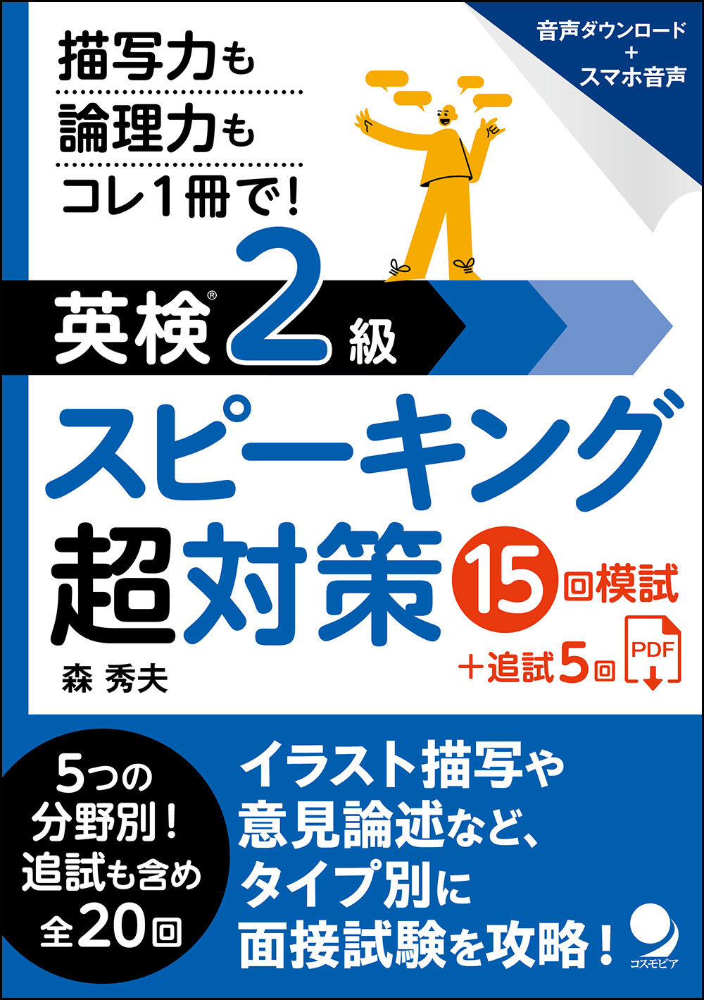 英検で頻出の「教育」「科学技術」「環境問題」「生活習慣」「社会問題」の5つのテーマ別に各3つずつの模試を用意しています。賛成・反対、Yes/Noなどの解答例と森秀夫先生の詳しいポイント解説で、パッセージの流れの押さえ方や言い換え表現のコツを学びます。