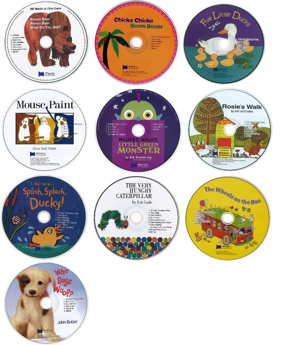 色が鮮やかで単語数が少ない絵本、穴あき絵本、ゆっくりした歌の絵本などをセットにしました。エリック・カール、ルーシー・カズンズの作品が含まれています。邦題『はらぺこあおむし』『くまさんくまさんなにみてるの?』が入っています。