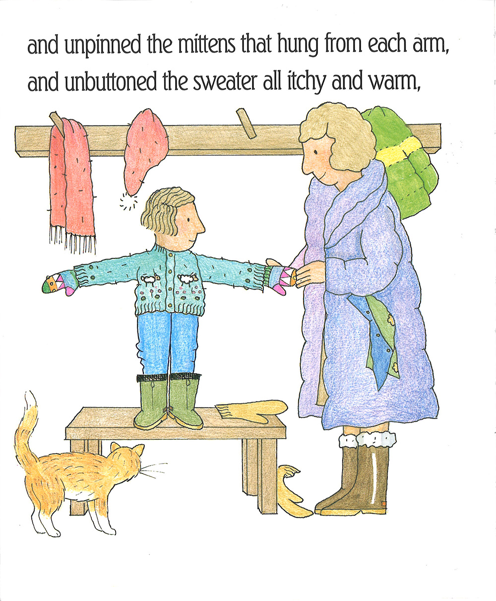 ジャケット、マフラー、帽子、手袋、セーター……。ページをめくるごとに身につけるものが増えていきます。ソリ遊びをして雪だるまにぶつかってしまい、泣き出した子どもをお母さんが助けに来てくれました。今度はマフラーをゆるめ、セーターのボタンをはずしと、服を脱いでいく表現が登場。韻を踏んだ繰り返しのフレーズが楽しめます。だんだん長くなっていく英文を、CDに合わせてうまく息継ぎして、最後までちゃんと歌えるかチャレンジ。